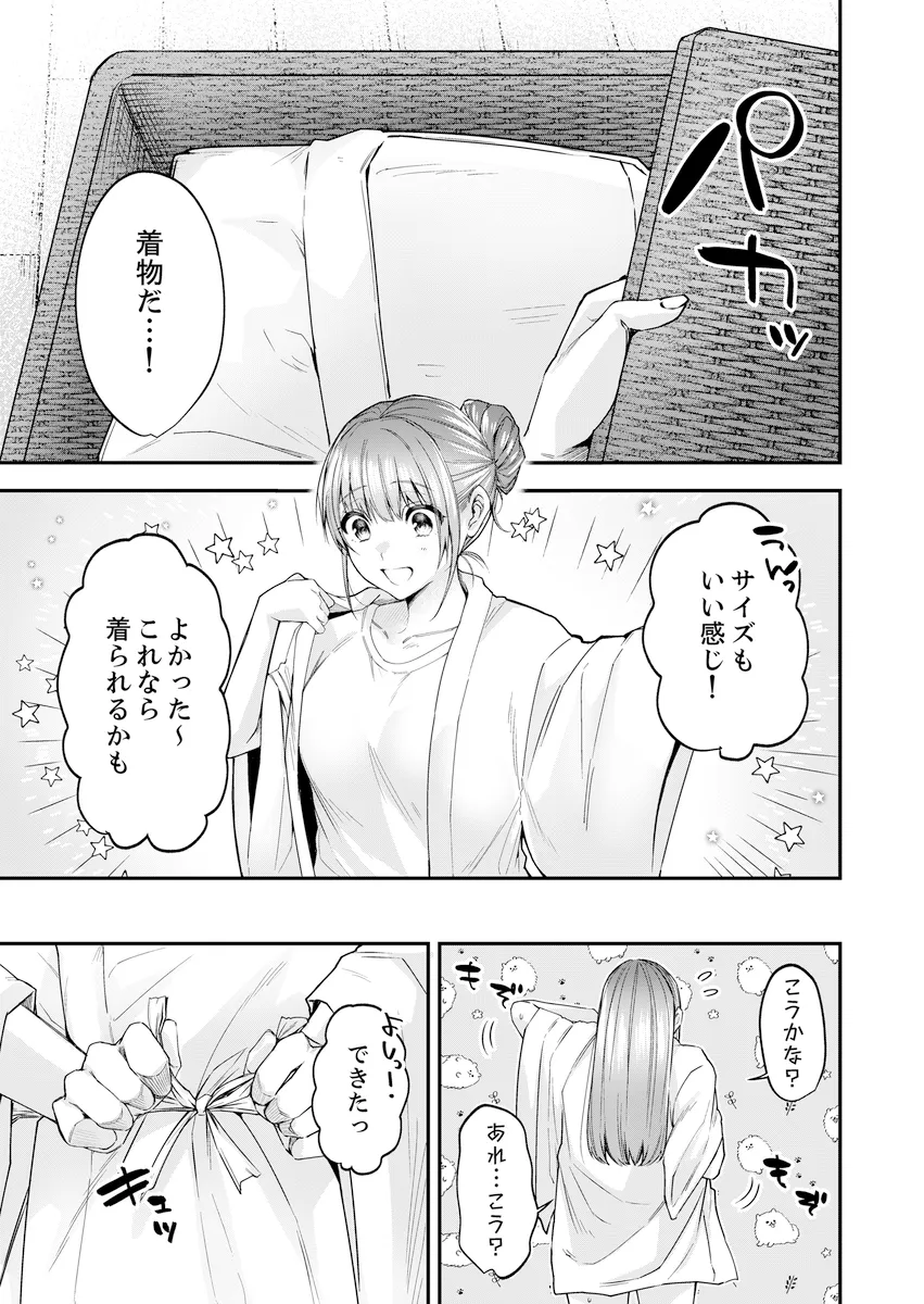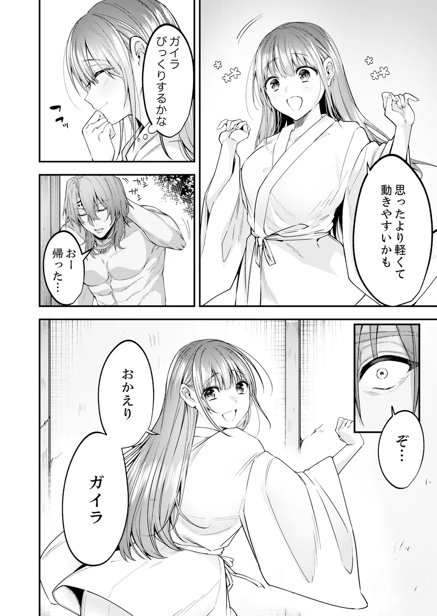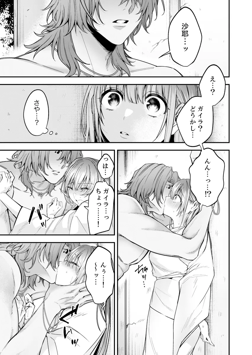 戦神ガイラに生贄として捧げられたサキは、ある出来事から彼と特別な絆を結ぶようになる。神域で暮らすための“神気”の儀式を通して、ふたりの距離は次第に深まっていった。ある日、昔の記憶を呼び起こす着物を身にまとったサキを見たガイラは動揺し、そのことが原因でふたりはすれ違ってしまう。不安定になった神力が暴走しかけたとき、サキが伝えた想いがガイラを正気へと導いた。気持ちを確かめ合ったふたりは、永遠を誓う儀式を行い、本当の番となる。サキは神と共に歩む未来を選び、ふたりの絆はより強く結ばれていく──。