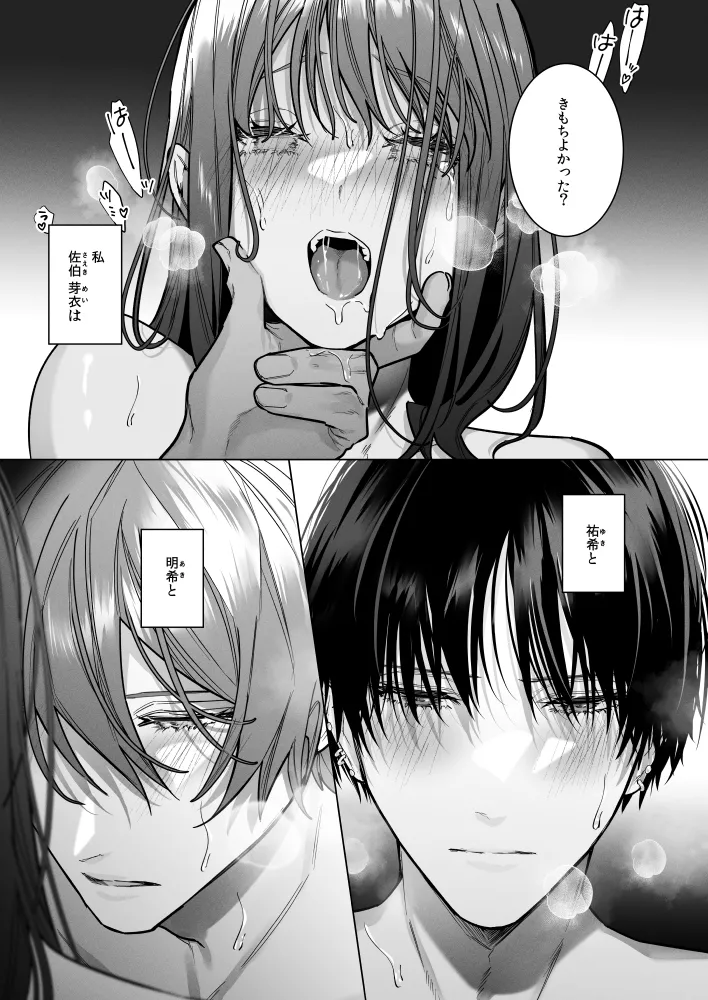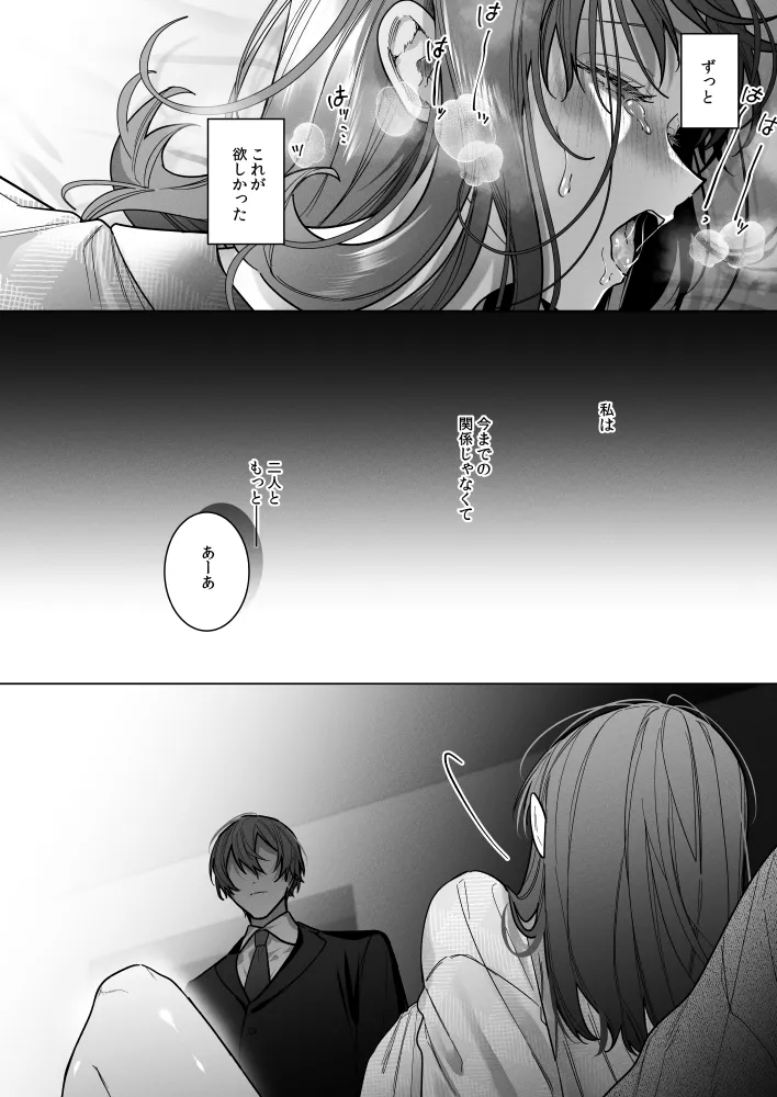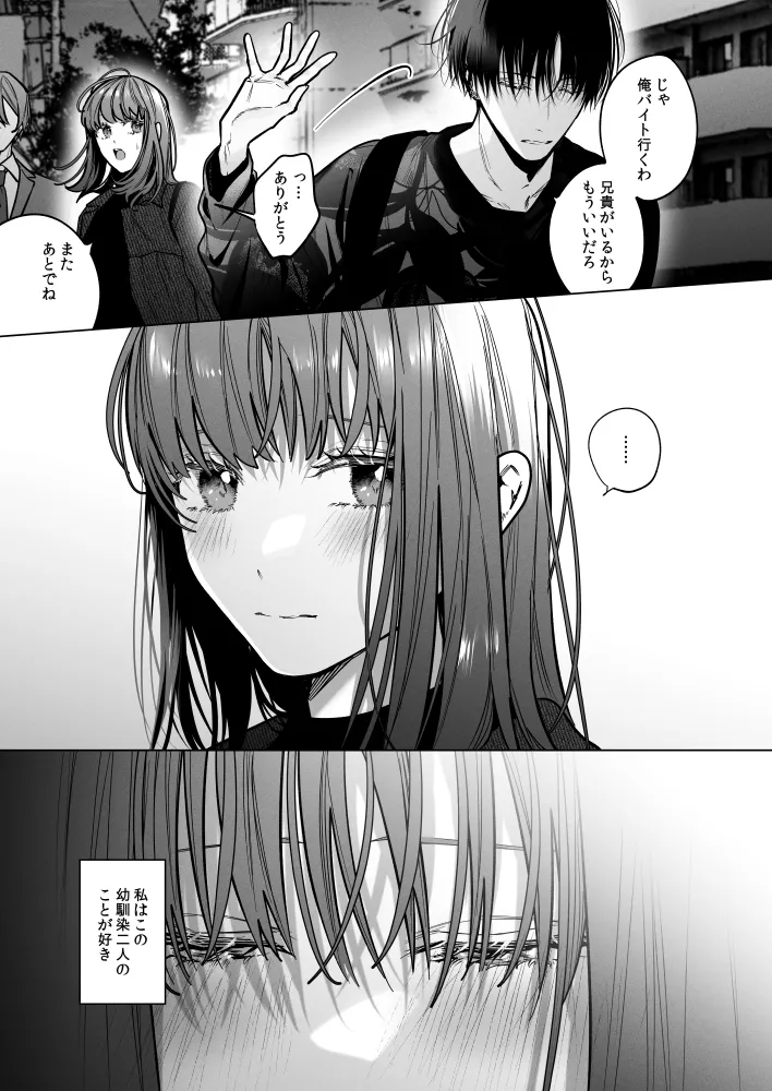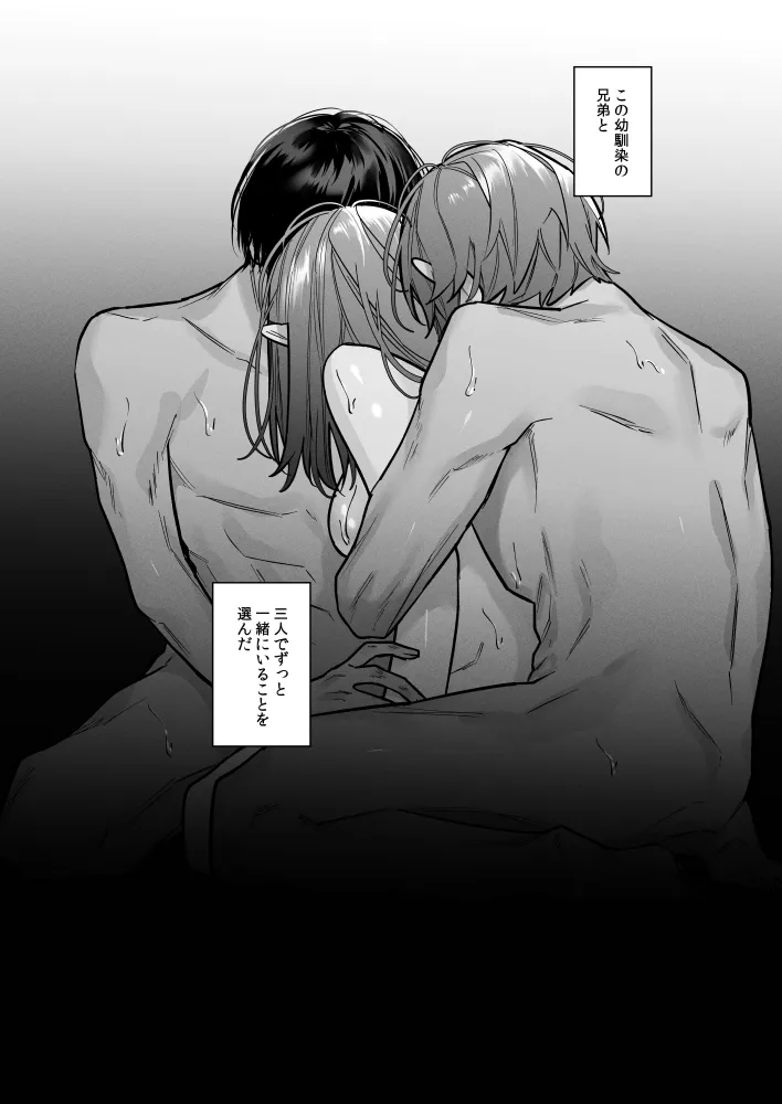 芽衣には、ずっと一緒に育ってきた幼馴染の兄弟がいた。同じ大学に通う祐希と、その兄で社会人の明希。ぶっきらぼうだけど優しい祐希と、気配り上手で包容力のある明希。芽衣はそんな二人を同時に好きになり、誰か一人を選ぶのではなく、三人で一緒にいる道を選んだ。やがて三人は、互いの本心を曖昧にしたまま、特別な関係を続けていく。そこには「必ず三人でいること」「一線は越えすぎないこと」という約束があった。けれど、重ねる時間の中で芽衣も兄弟も次第に想いを抑えきれなくなっていく。ある出来事をきっかけに、三人の均衡は崩れ始める。独占欲、嫉妬、執着――隠していた感情が一気にあふれ出し、ただの幼馴染ではいられなくなった三人は、歪で甘い関係の奥へと踏み込んでいく。誰も手放せないまま、三人がたどり着く答えとは――。