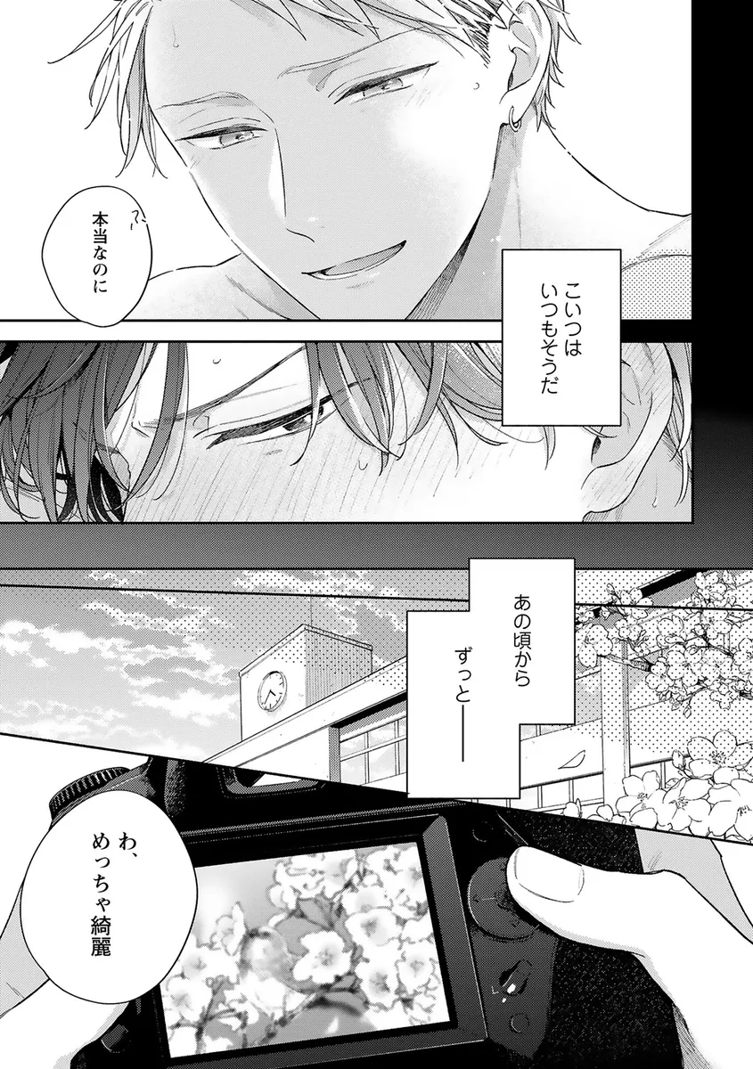 カメラマンとして活躍する五十嵐には、誰にも言えない関係がある。相手は人気スタイリストの志田。酔った時だけ抱かれる、曖昧なセフレ関係だ。けれど五十嵐は、高校時代からずっと志田に片想いをしていた。目立つ存在だった志田とは無縁だと思っていたのに、写真をきっかけに距離が縮まり、いつしかその隣が特別な場所になっていた。そして志田の姿を追いかけたある日、自分の想いが本物だと気づいてしまう。告白してこの関係まで失うくらいなら、せめて抱かれた記憶だけでも残したい。そう思う五十嵐に、志田は無邪気に「好きだ」「可愛い」と囁いてきて――。