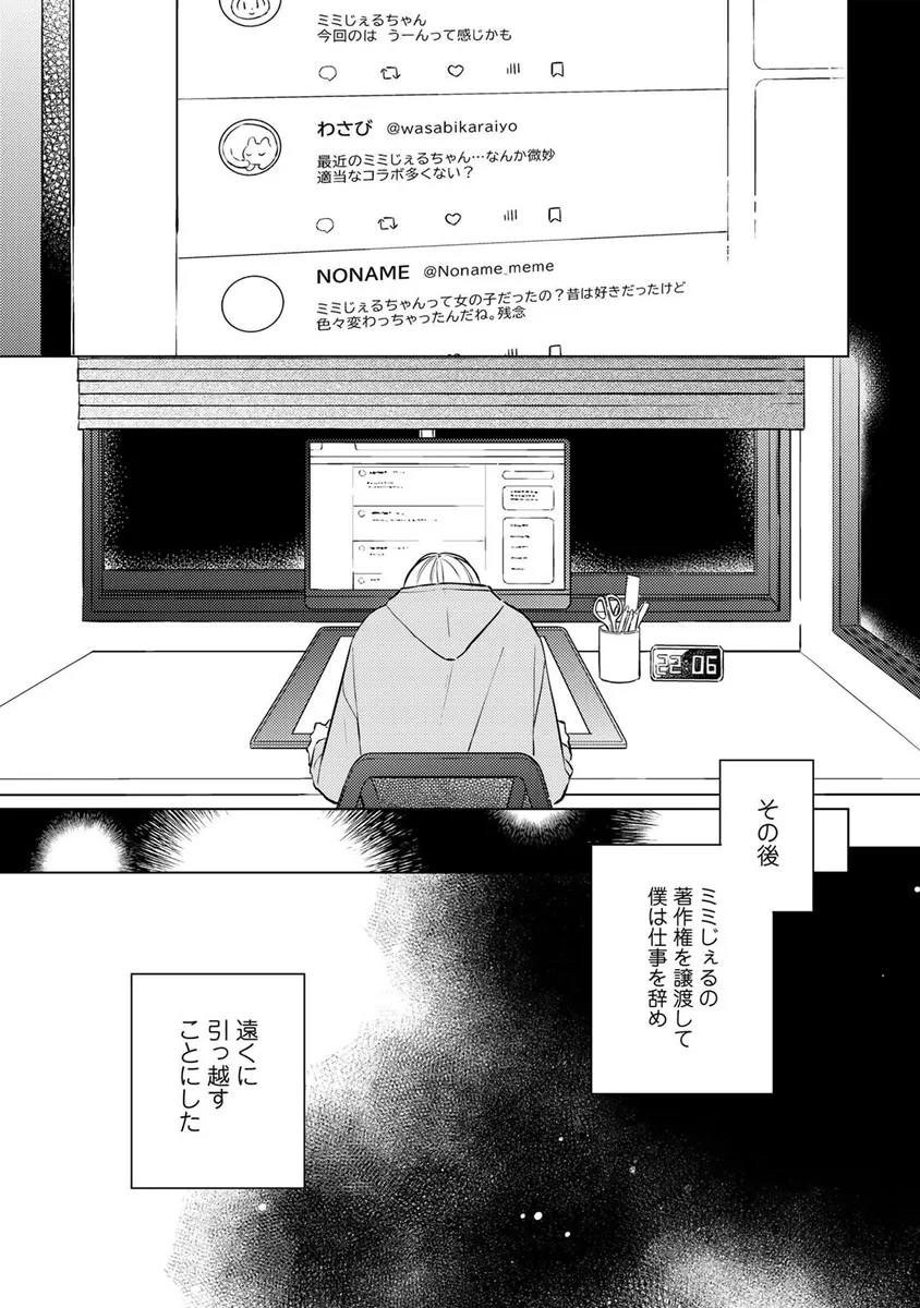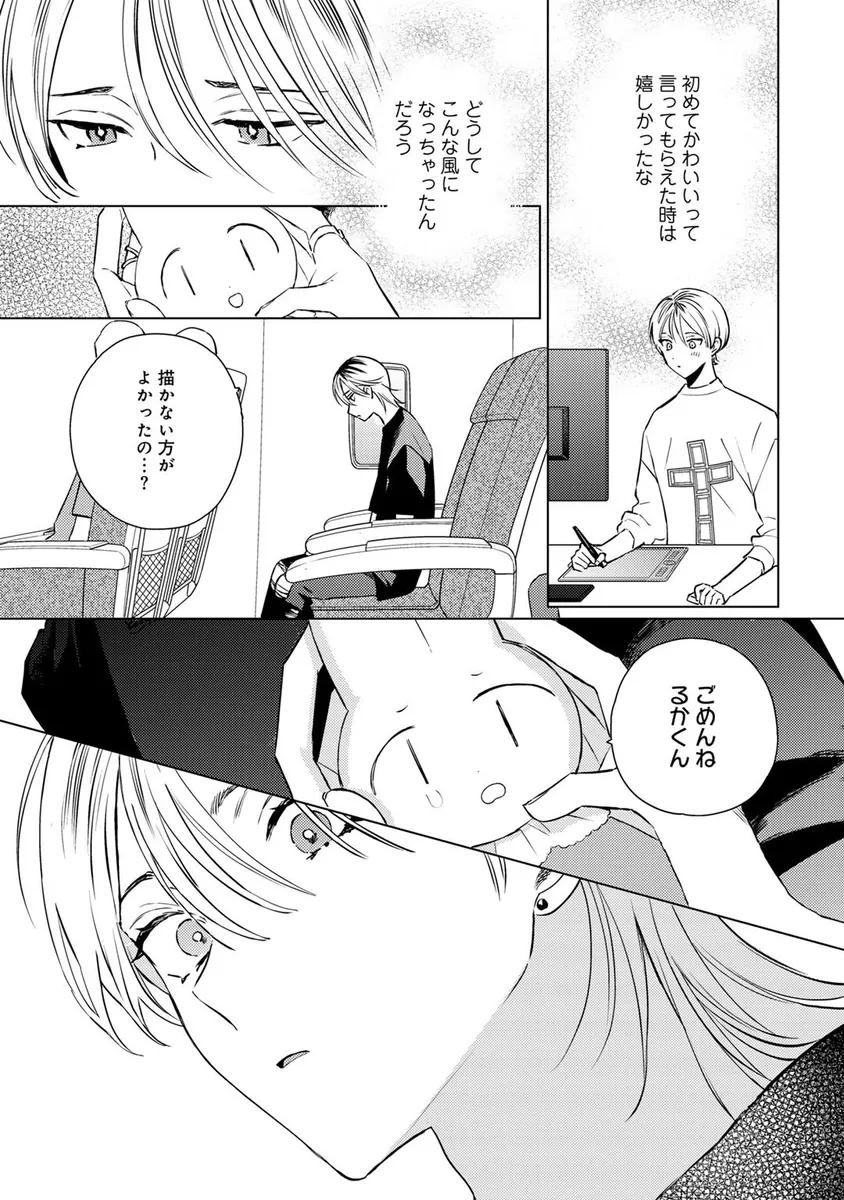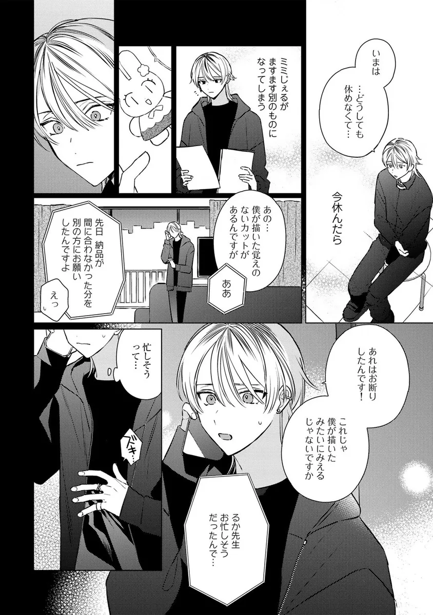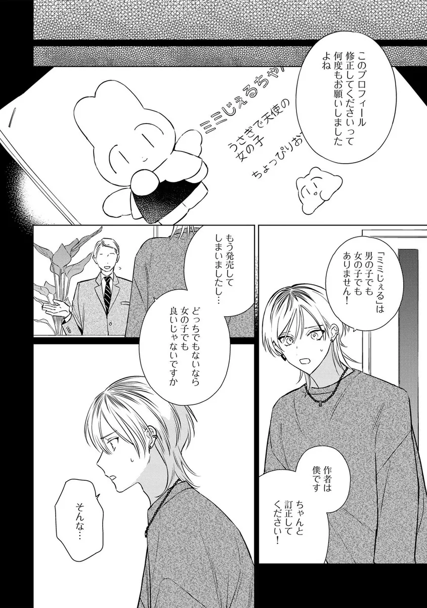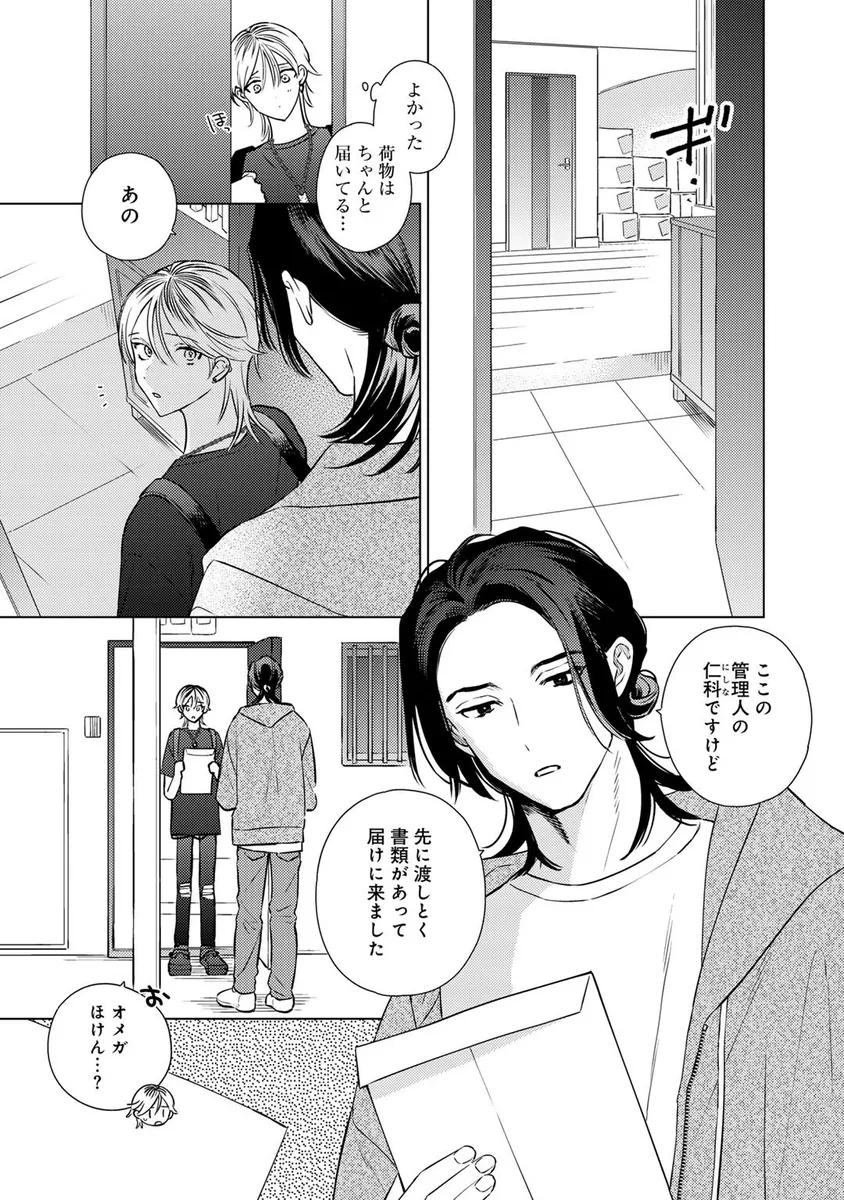 人気キャラクター「ミミじぇる」の作者として活動していた青年・伊波るく。しかし、ある日突然「ミミじぇるの絵柄が変わった」「作者は女性じゃなかったのか」といった心ない声に傷つき、るくは仕事を辞めて遠くの街へ引っ越すことを決める。新天地へ向かう飛行機の中、るくは大きな揺れをきっかけに記憶が曖昧になり、さらに病院で「第二性別」に関する思いがけない検査結果を告げられてしまう。混乱したまま新居へ向かったるくの前に現れたのは、少しぶっきらぼうで威圧感のある管理人の男性。人と関わることに臆病になっていたるくは、彼の不器用な優しさに戸惑いながらも、少しずつ心を揺らされていく。過去の傷、隠してきた自分、そして思いがけない出会いが交差する、繊細な再出発BL。