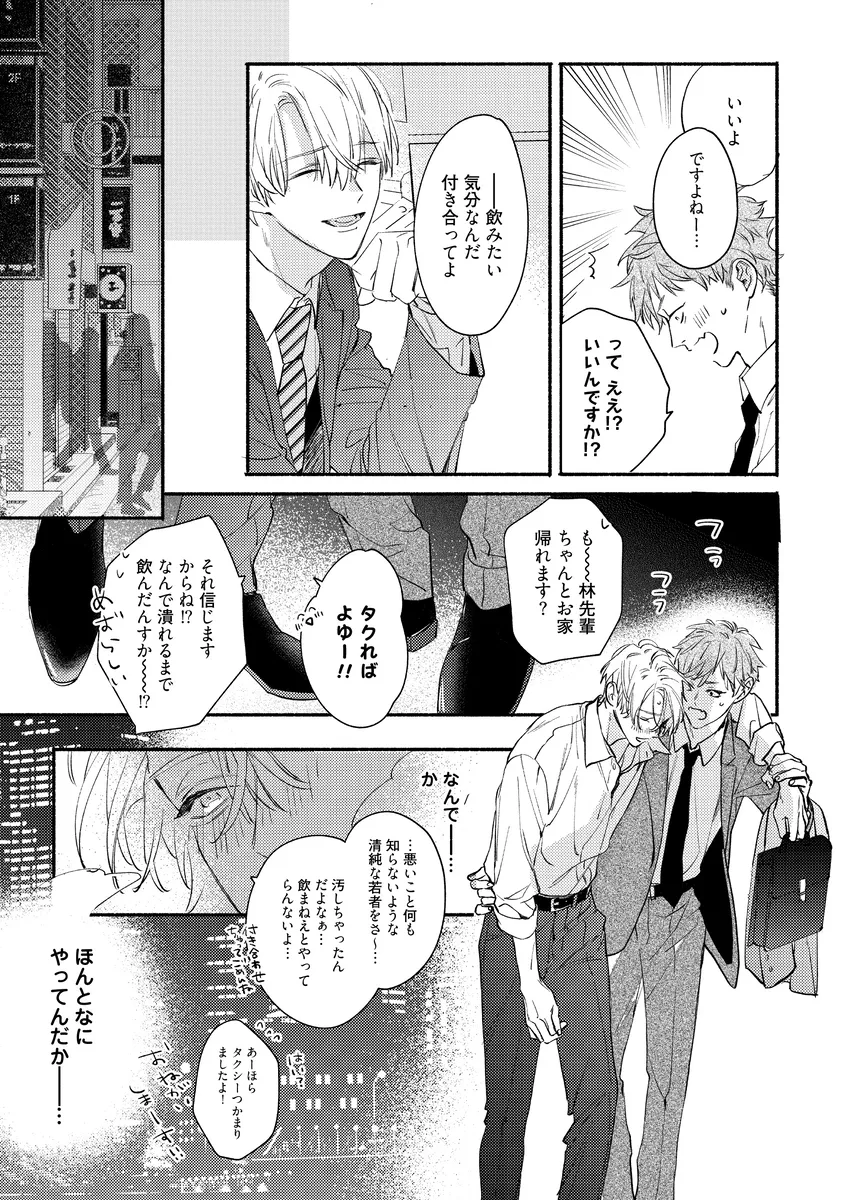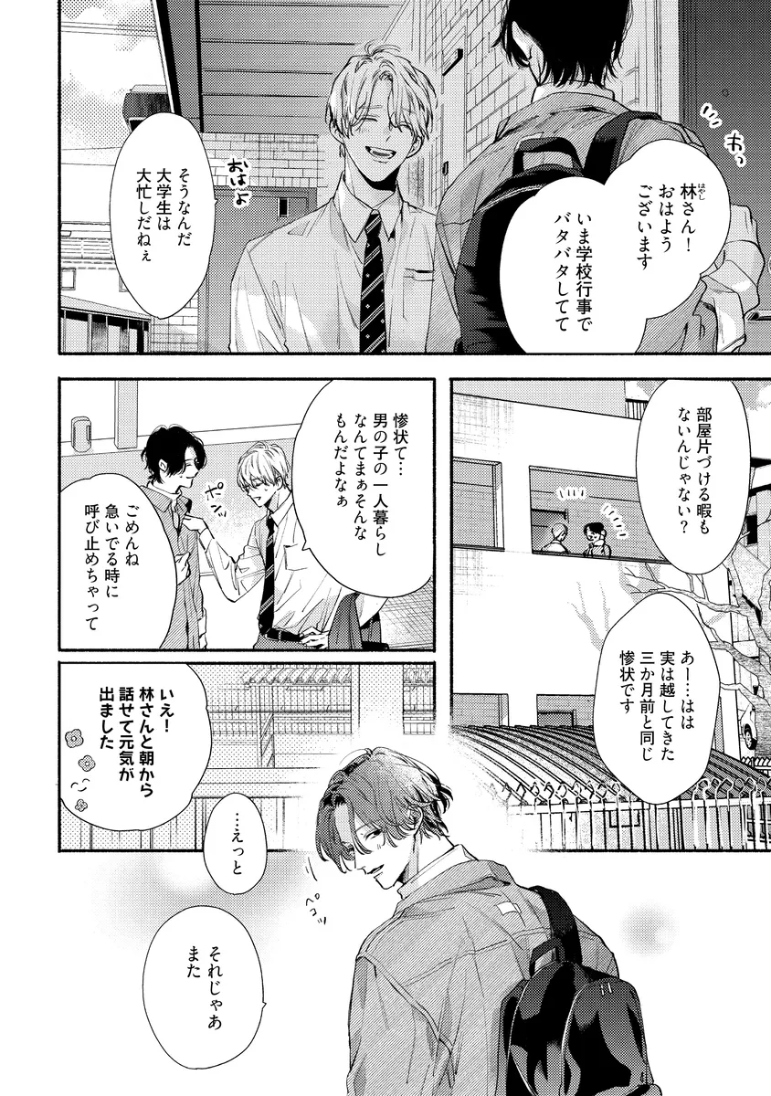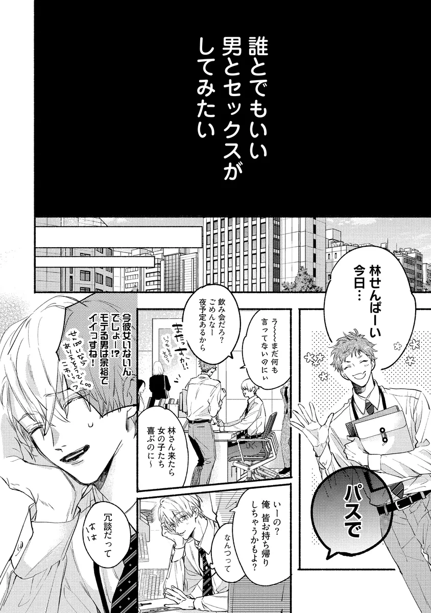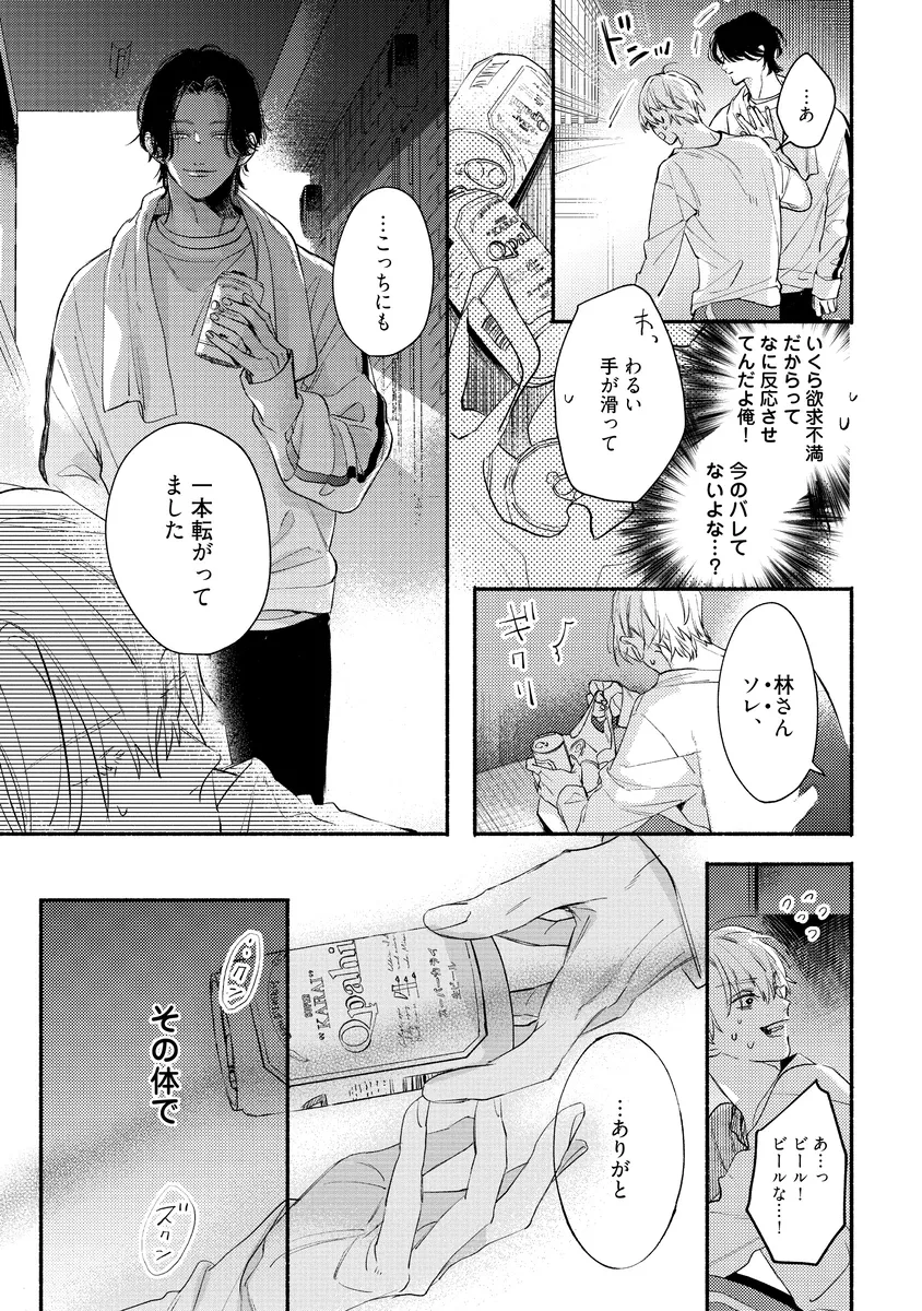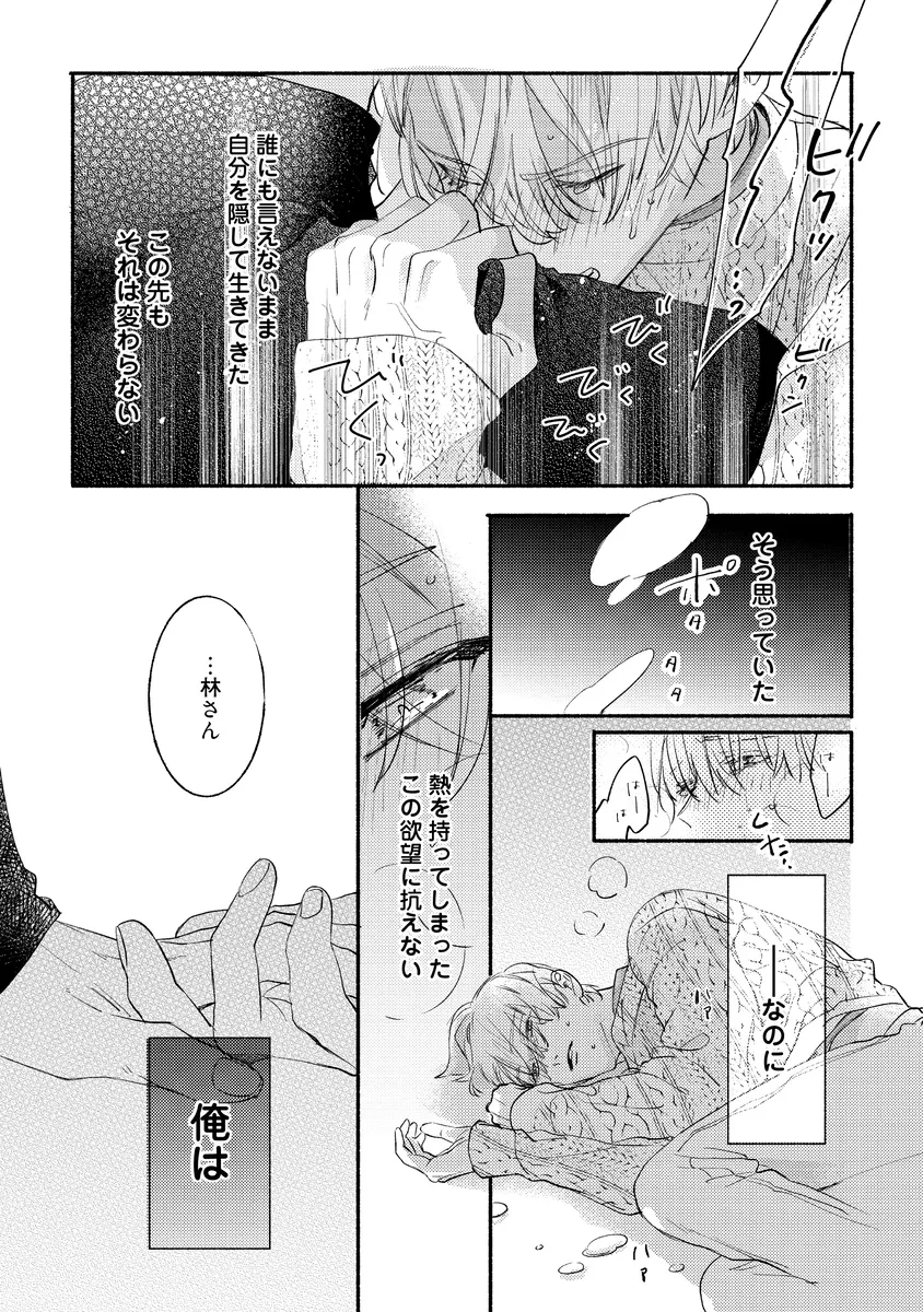 誰しも人には言えない隠し事が一つや二つあるだろう。林は朝の通勤中、大学生の吉鷹と顔を合わせる。朝の挨拶を交わしてから会社に行くのが林の日課だった。そんな林にはどうしてもいないことがあった。誰でもいいから男とセックスをしてみたい。彼女がいたことはあった。でもどうしても勃起できなかったのだ。林はゲイだった、生まれたときからずっと。世間と違う自分を誰にも知られたくなかった。誰も愛さないし、誰からも愛されず、一生独りでいる覚悟もしていた。なのに、心の底ではこの欲望を満たしてくれる相手をどこか求めてしまっている。その夜、林はランニングしていた吉鷹と偶然会う―。