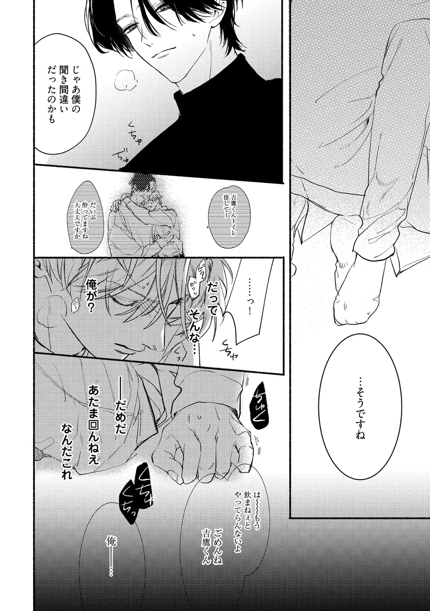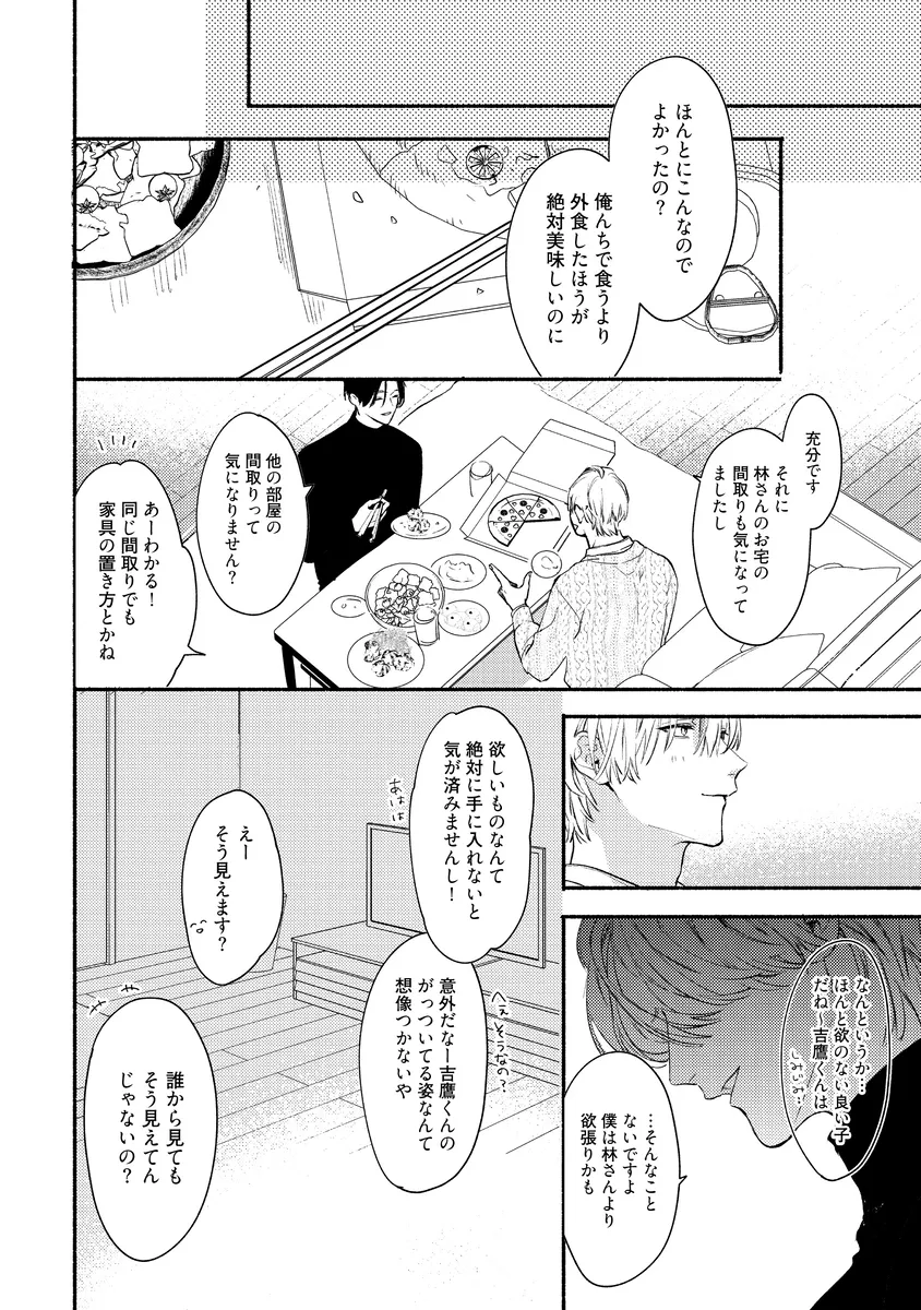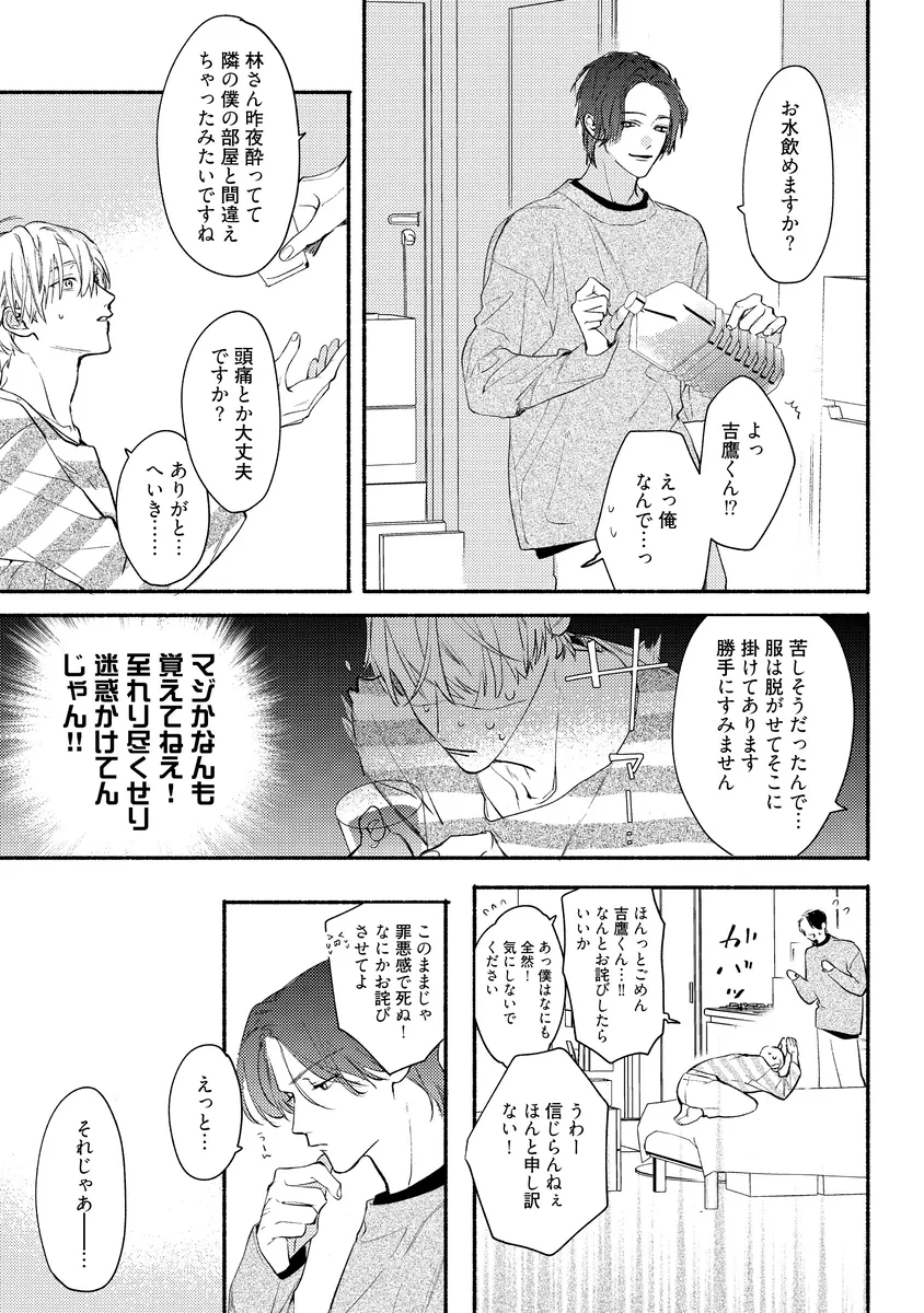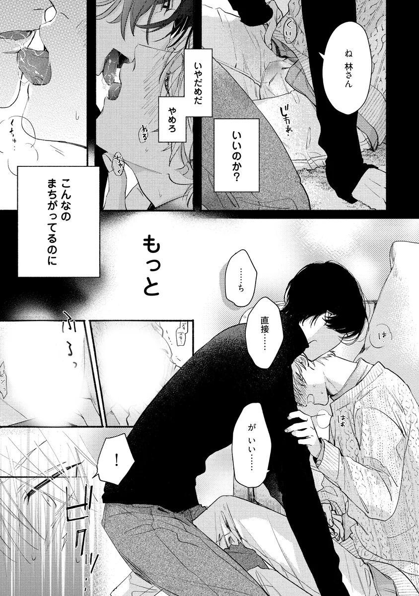 誰しも人には言えない隠し事が一つや二つあるだろう。林は朝の通勤中、大学生の吉鷹と顔を合わせる。朝の挨拶を交わしてから会社に行くのが林の日課だった。そんな林にはどうしてもいないことがあった。誰でもいいから男とセックスをしてみたい。彼女がいたことはあった。でもどうしても勃起できなかったのだ。林はゲイだった、生まれたときからずっと。世間と違う自分を誰にも知られたくなかった。誰も愛さないし、誰からも愛されず、一生独りでいる覚悟もしていた。なのに、心の底ではこの欲望を満たしてくれる相手をどこか求めてしまっている。その夜、林はランニングしていた吉鷹と偶然会う―。